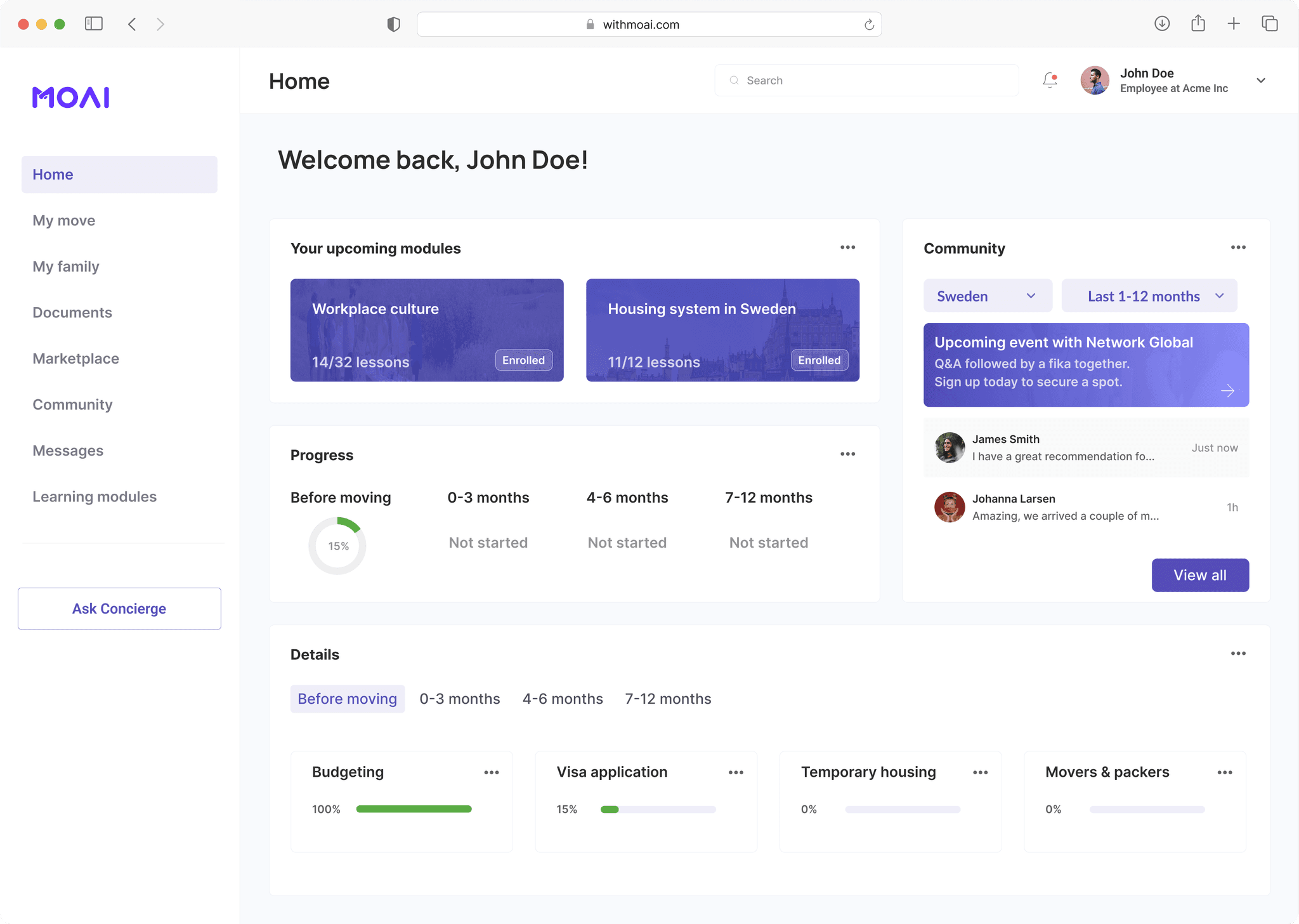 Navigate your relocation journey with ease, follow automated step-by-step moving plans, collaborate with your family members, engage in learning modules for cultural integration, and be part of a community.
